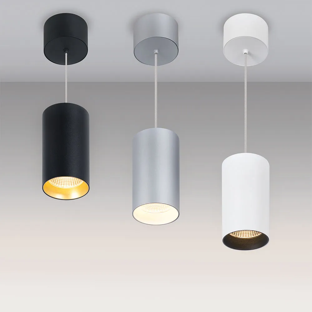 Подвесной светильник 15Вт, серебристый круглый корпус, черная вставка, металл. Цвет ДНЕВНОЙ БЕЛЫЙ 4000K, св.поток 1100лм, CRI(Ra)>80, угол 40°. Размер Ø85x155мм. Встроенный драйвер PRI:220-240VAC, SEC:DC 500mA 23-36V 15Вт.