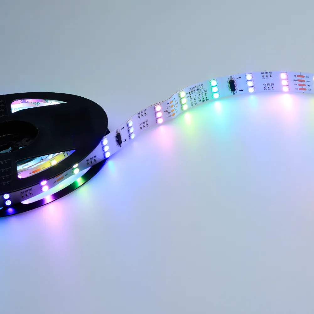 Гибкая открытая трехрядная лента «Бегущие огни» (IP20) с драйвером 1812. Длина 5м, 480шт LED RGB 5060, 32 pixel/m (1 pixel = 3 LED в одном столбце). Питание 12V, ном. мощн.12,8 Вт/м, макс. мощн-ть 16 Вт/м (статический белый цвет). Необходима подводка пит-я с 2 сторон ленты. Ширина 20 мм. Негерметичные ПРЯМОУГОЛЬНЫЕ коннекторы.