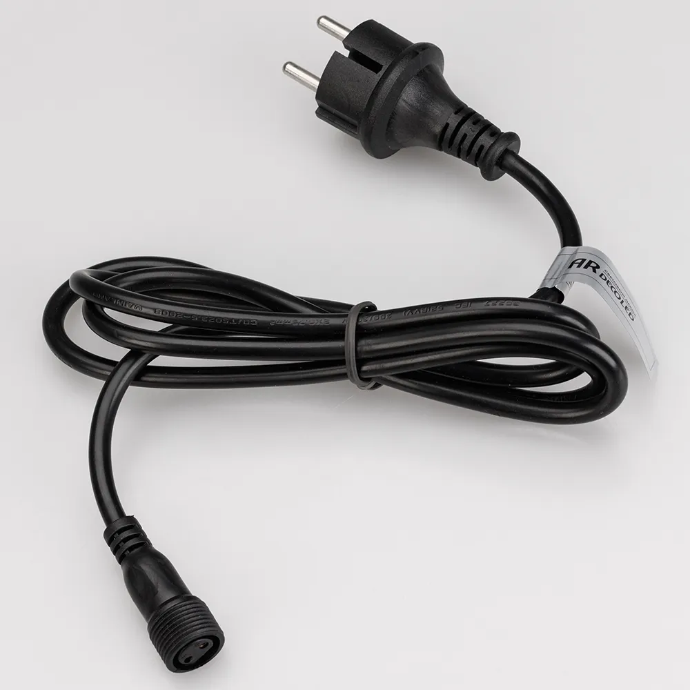 Шнур питания для светодиодных гирлянд ШАРИКИ, НИТЬ c эффектом МУЛЬТИКОЛОР. Материал оболочки ПВХ. В комплект входит: шнур питания с вилкой европейского стандарта, разъём подключения к гирлянде. Цвет провода чёрный. Длина провода 1.5 метра.