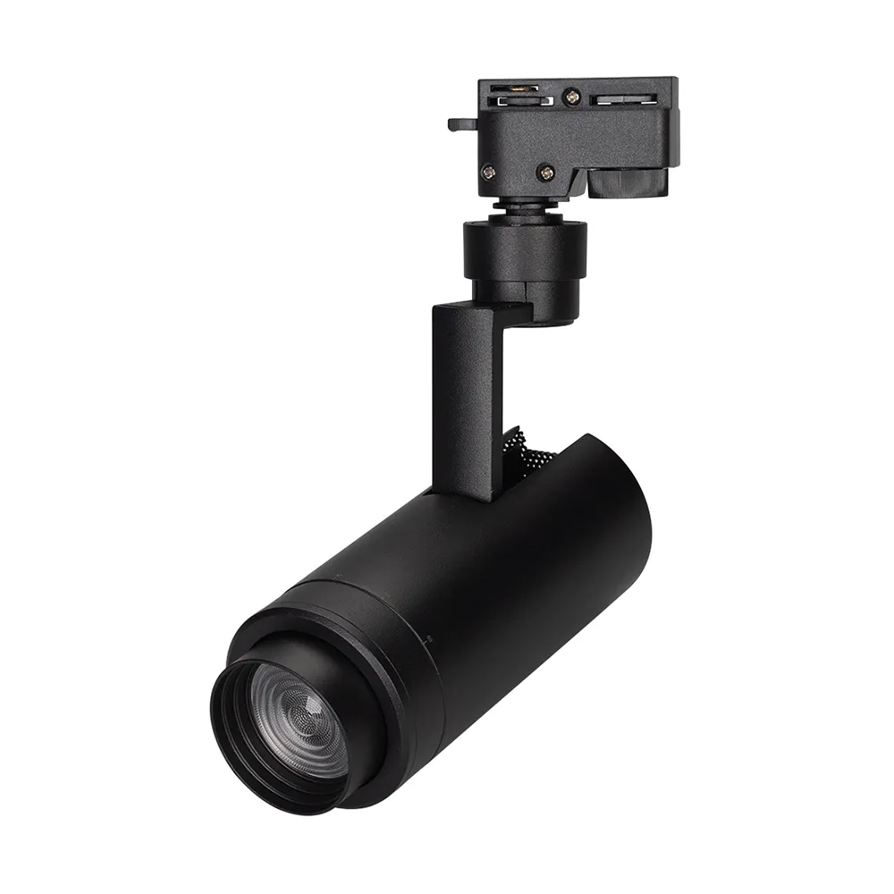Светильник подвесной для треков/шин 2 провода, 10Вт. Цвет свечения ТЕПЛЫЙ 3000K, световой поток 800-1000лм, регулируемый угол 20-60°, CRI>90. Корпус круглый, металл, цвет черный. Размеры DxHxL Ø67x180x155мм. Входное напряжение AC220-240V, мощность 10Вт. Драйвер встроенный (27-38V, 260mA).