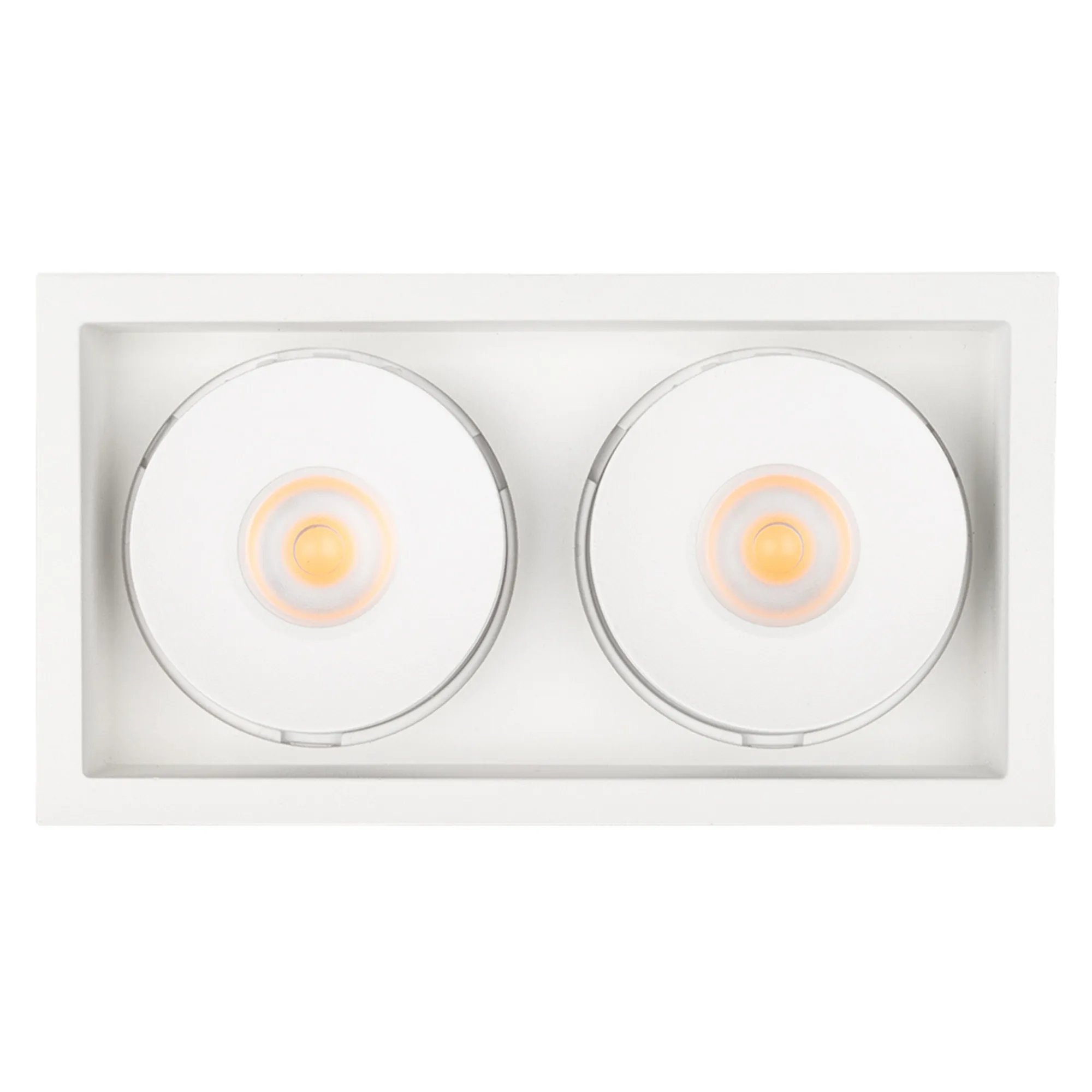 Встраиваемый поворотный светильник для потолка. Мощность 2x9W, цвет ТЕПЛЫЙ 3000K, св.поток 1260лм, угол 45°, RA>90. Корпус прямоугольный белый. Питание AC180-240V. Размеры LxWxH 148x80x90мм. Установка в отверстие 140x70мм. Драйвер в комплекте 2 шт (30-45V, 220mA).