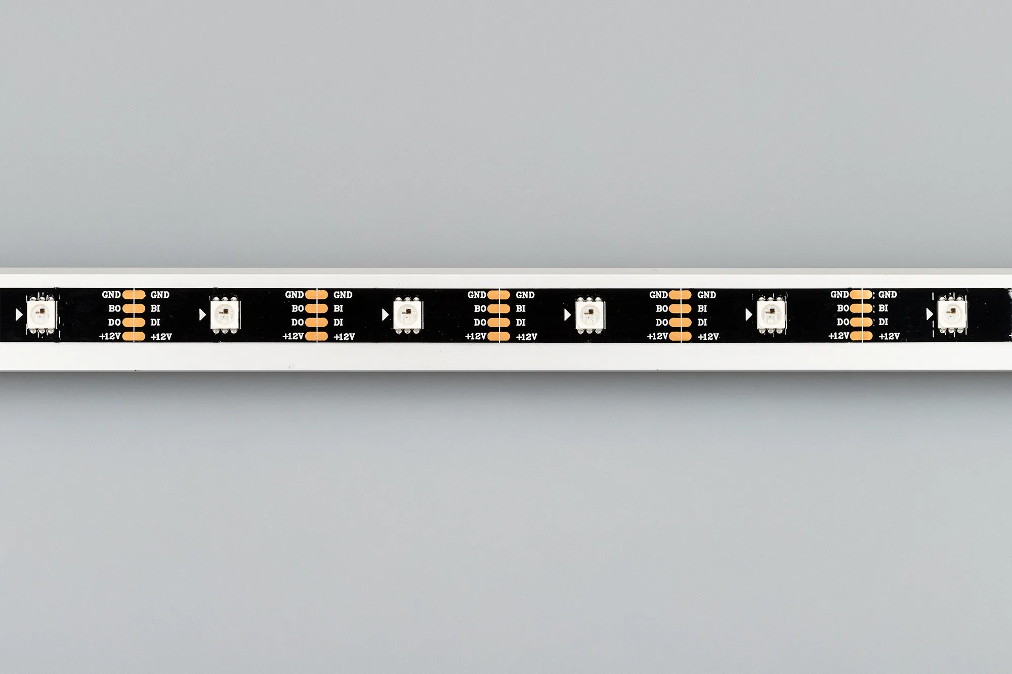 Открытая лента «Бегущие огни» на ЧЕРНОЙ подложке с драйвером 2815 (битый пиксель не влияет на передачу сигнала далее по ленте), драйвер+ LED в одном кристалле, встроенный в ленту контроллер с циклическим автозапуском 300 программ (Auto mode) и подкл-ем внеш. контроллера. Длина 5м, 150шт LED RGB 5060, 30 pixel/m (1 pixel = 1 LED). Питание 12V, макс. мощн-ть 4,8 Вт/м. Ширина 10 мм. Негерметичные прямоугольные коннекторы.