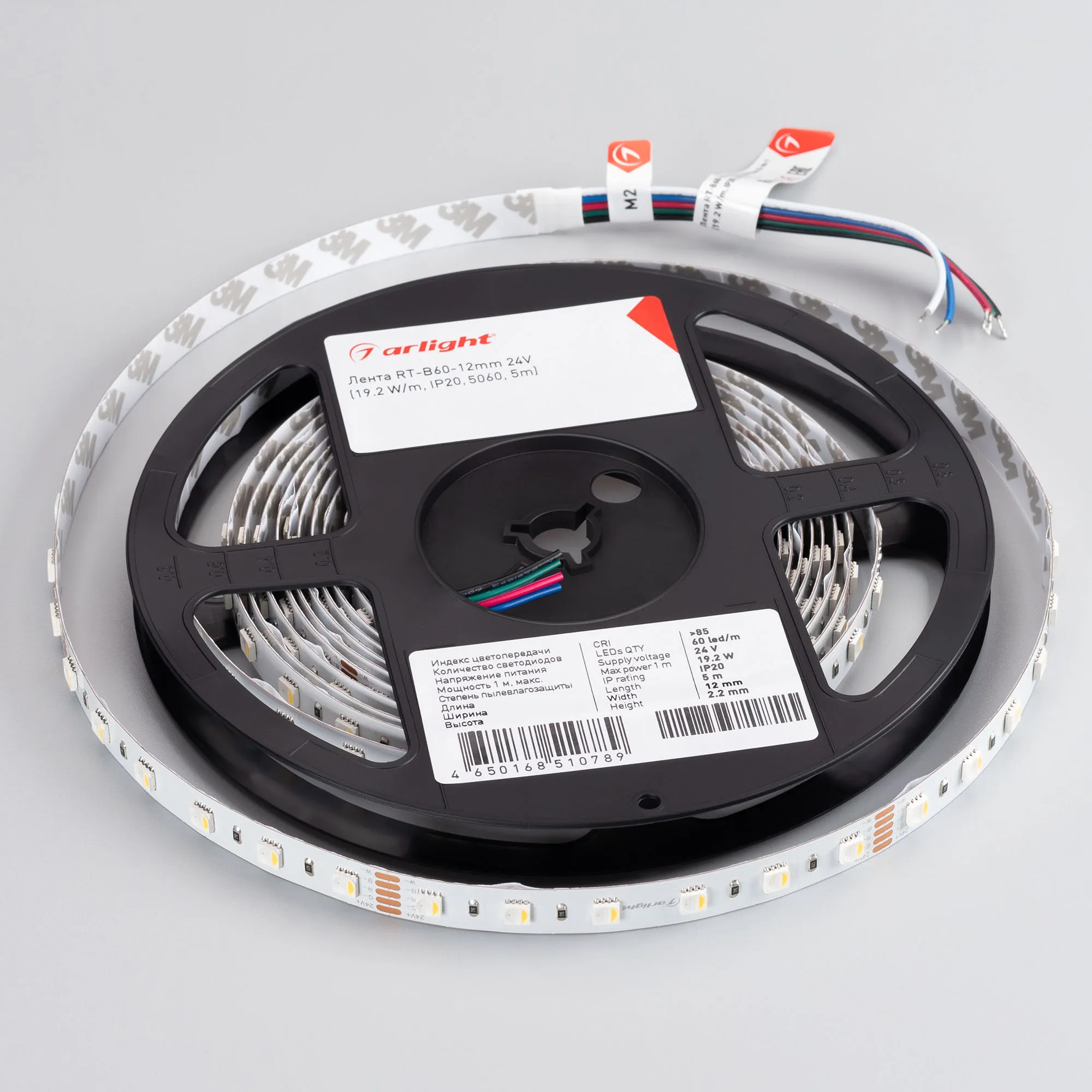 Светодиодная лента RT серии B60. Светодиоды 5060 4-in-1, 60 шт/м, белая плата шириной 12 мм, скотч 3M. Цвет RGB + ТЕПЛЫЙ 3000K, индекс цветопередачи CRI>85, угол 120°. Питание 24 В, мощность 19.2 Вт/м (96 Вт на 5 м). Размеры 5000x12x2.2 мм. Мин. отрезок 100 мм, 6 светодиодов. Цена за 1 м.