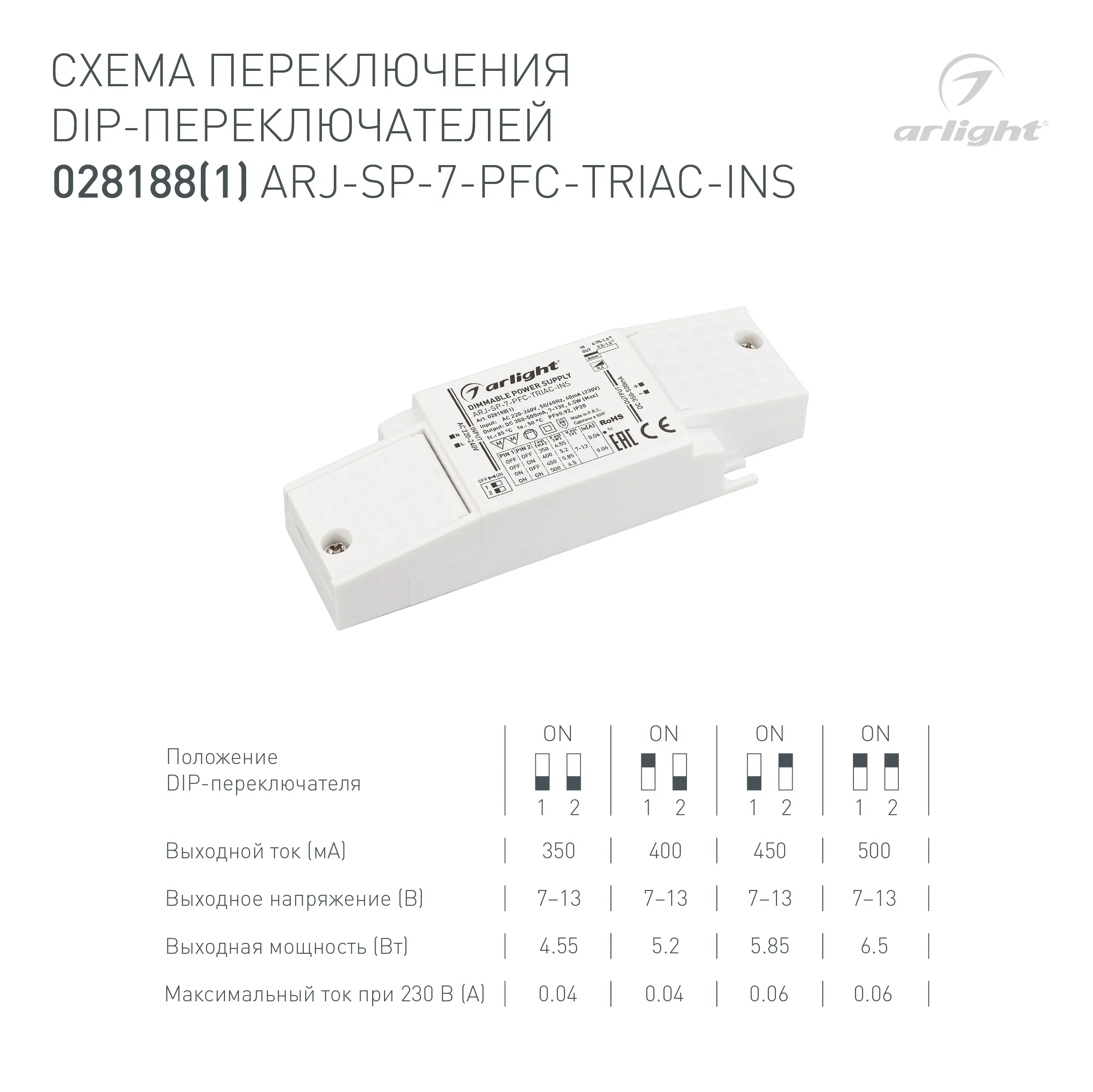 Блок питания ARJ-SP-7-PFC-TRIAC-INS (7W, 7-13V, 0.35-0.5A) (Arlight, IP20 Пластик, 5 лет)