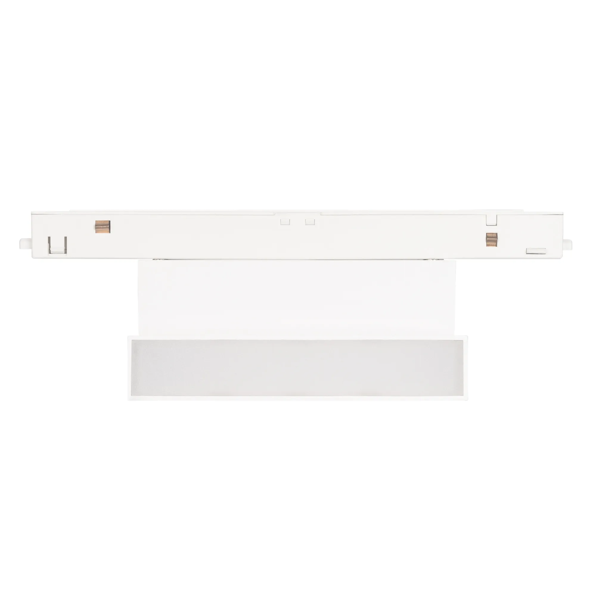 Светильник для магнитных треков MAG-ORIENT шириной 26 мм с управлением DALI. Мощность 6 Вт, св. поток 370 лм, 60 лм/Вт, теплый 3000 K, CRI>90, угол 80°, напряжение питания 48 В. Белый прямоугольный корпус из металл, экран поликарбонат, степень защиты IP20. Размер: длина 204 мм, ширина 23 мм, высота 99 мм. Монтаж на трек MAG-ORIENT, пульсация <1%.