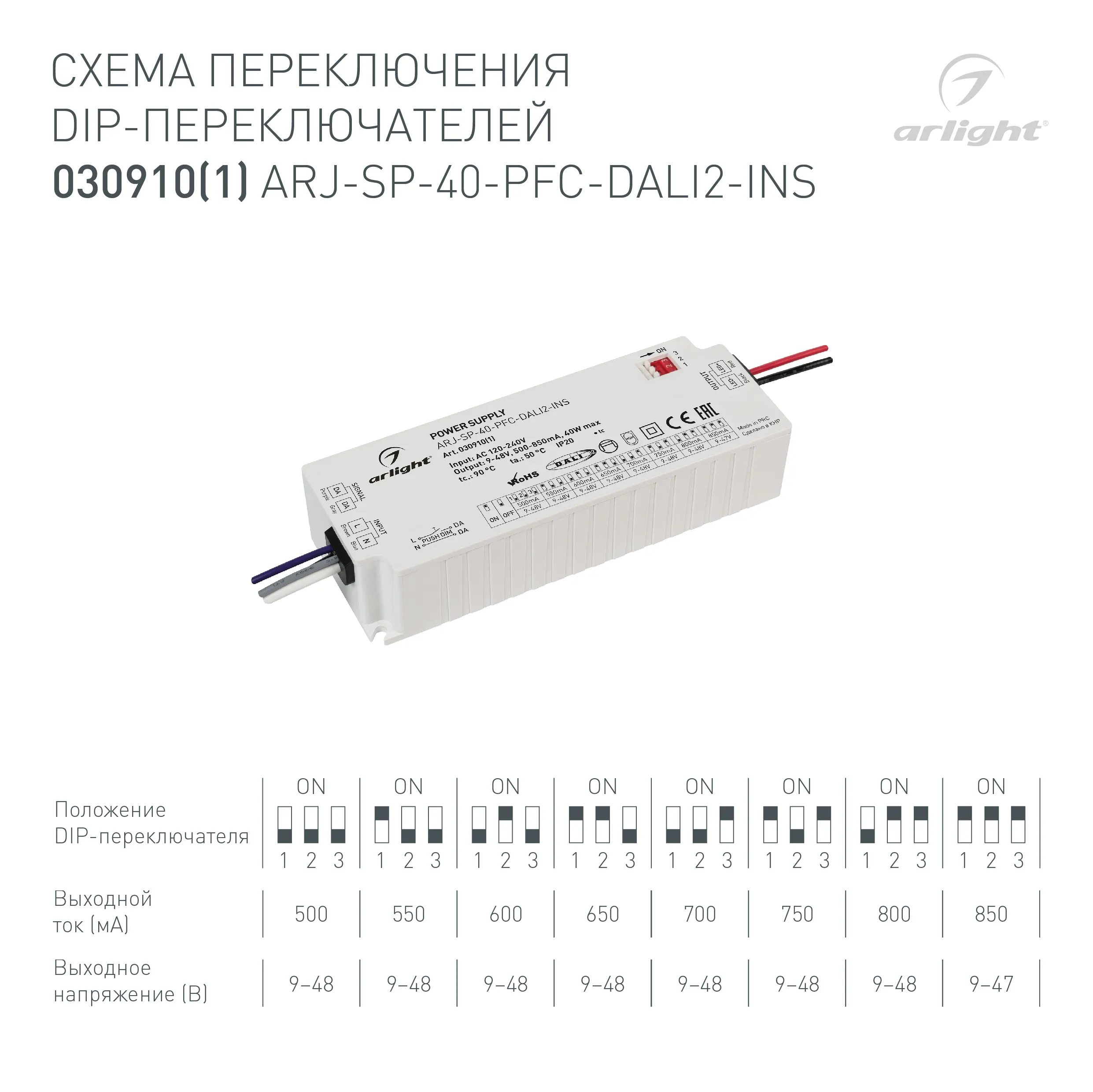 Блок питания ARJ-SP-40-PFC-DALI2-INS (40W, 9-48V, 0.5-0.85A) (Arlight, IP20 Пластик, 5 лет)
