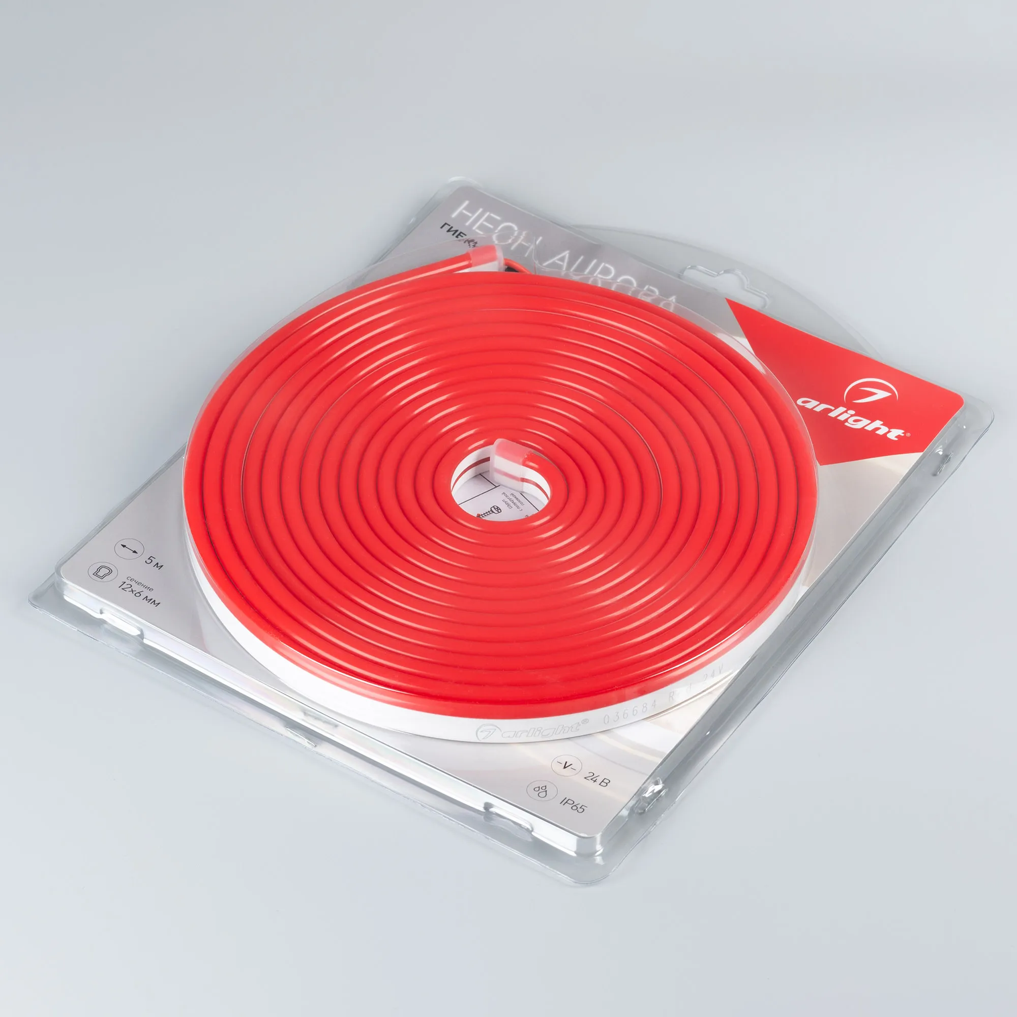 Гибкий неон AURORA в силиконовой оболочке. Светодиоды SMD2835, 120 шт-м, цвет КРАСНЫЙ. Сечение 12х6 мм, горизонтальный (боковой) изгиб, IP65, шаг резки 8.33 мм, мощность 10 Вт-м, напряжение питания DC 24V. Укомплектован заглушками и 30см проводом питания.