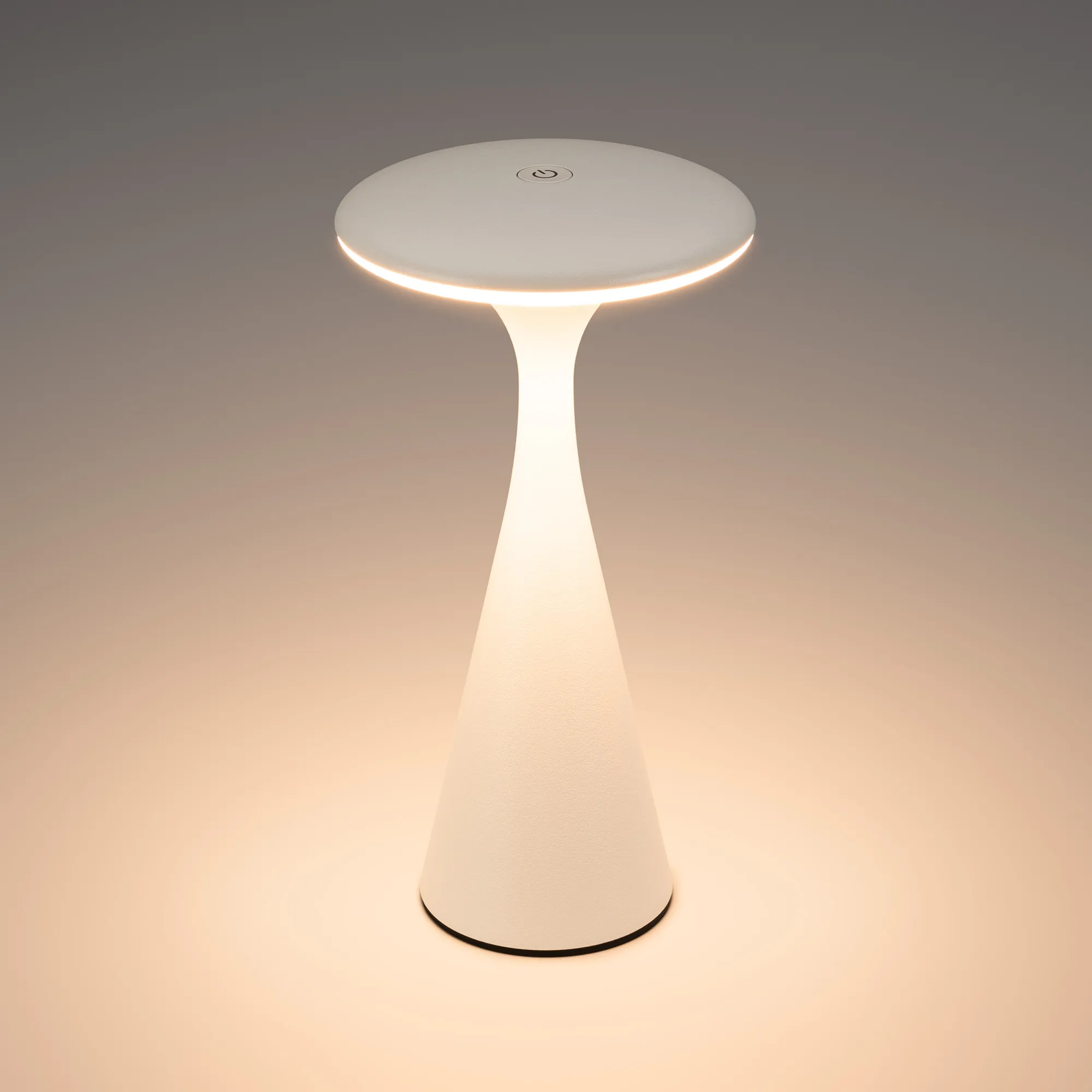 Настольный светильник со встроенным аккумулятором 1.5Вт, белый алюминиевый корпус. Цвет ТЕПЛЫЙ БЕЛЫЙ 2200-3000K, св.поток 110лм, CRI(Ra)>80, угол 123°. Размер Ф101x197мм. IP54. Зарядка от сети переменного тока AC220-240V. Тип встроенного аккумулятора 2600мАч Li-ion, напряжение батареи 3.7V