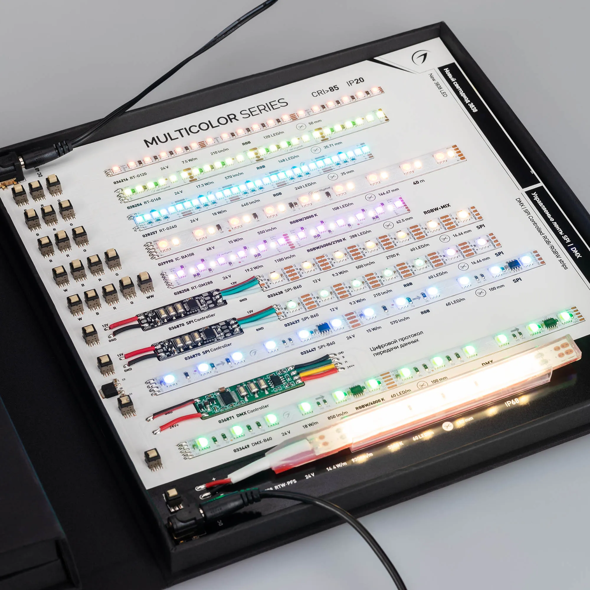 В кейс входят 42 образца моделей лент COB, RT, MICROLED, IC, MIX, SPI, DMX.