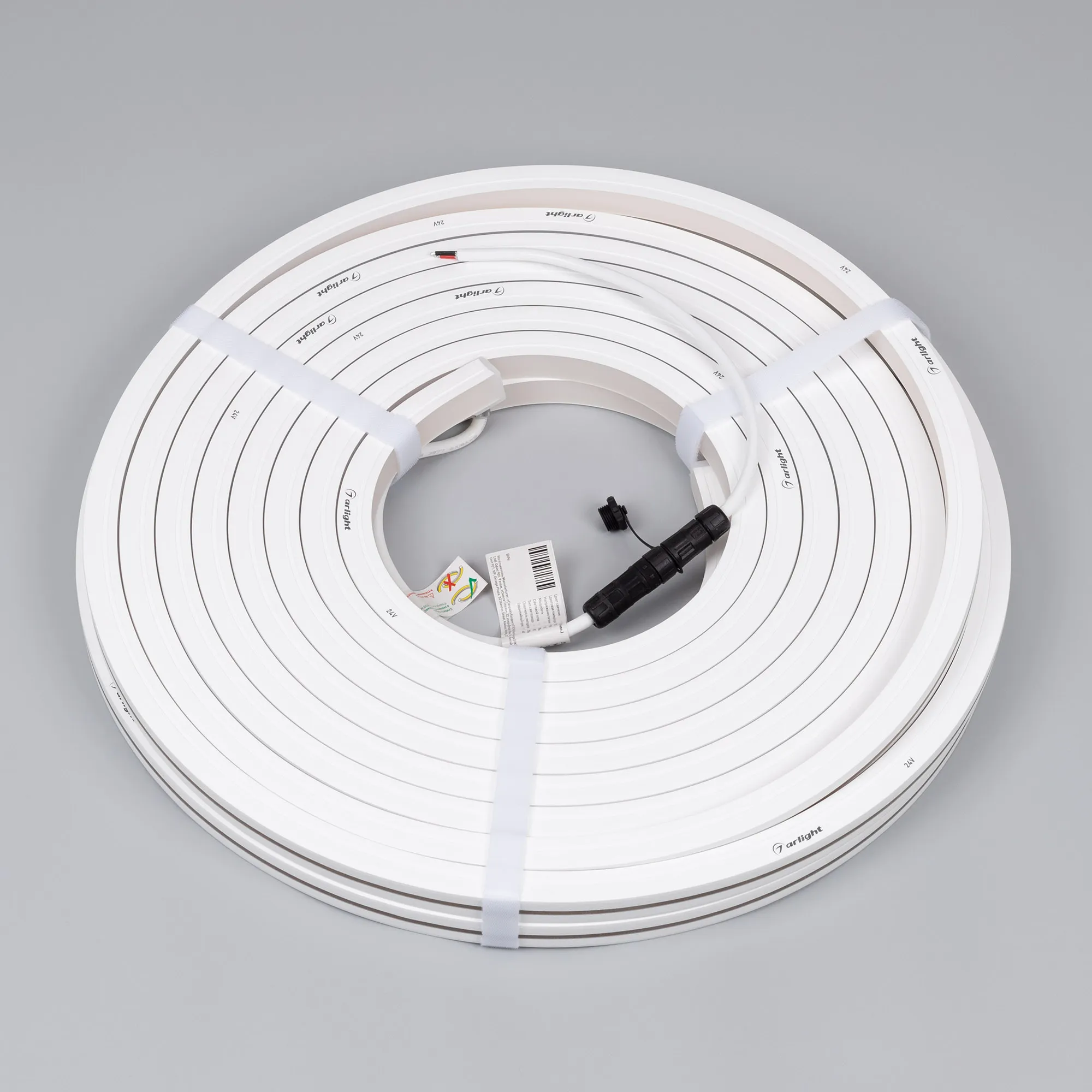 Гибкая герметичная лента (неон серии MOONLIGHT), сечение 16×16 мм. Светодиоды CSP 280 шт/м. Цвет свечения ТЁПЛЫЙ (2300К), индекс цветопередачи CRI>90, световой поток 380 лм/м, угол излучения 114°. Мощность 10 Вт/м, питание 24 В. Класс пылевлагозащиты IP67. Размеры 15000×16×16 мм. Мин. отрезок 50 мм. Вертикальный изгиб TOP, минимальный радиус изгиба 120 мм. Катушка 15 м. Цена за 1 м. Гарантия 5 лет.