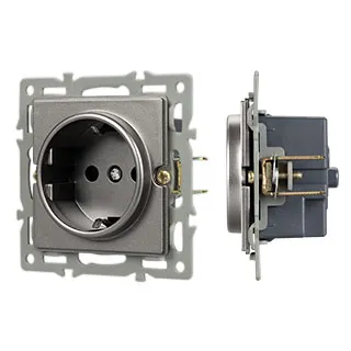 Механизм розетки с заземлением на 1 пост, с суппортом из алюминия. Цвет - серый. Степень пылевлагозащиты - IP20.
