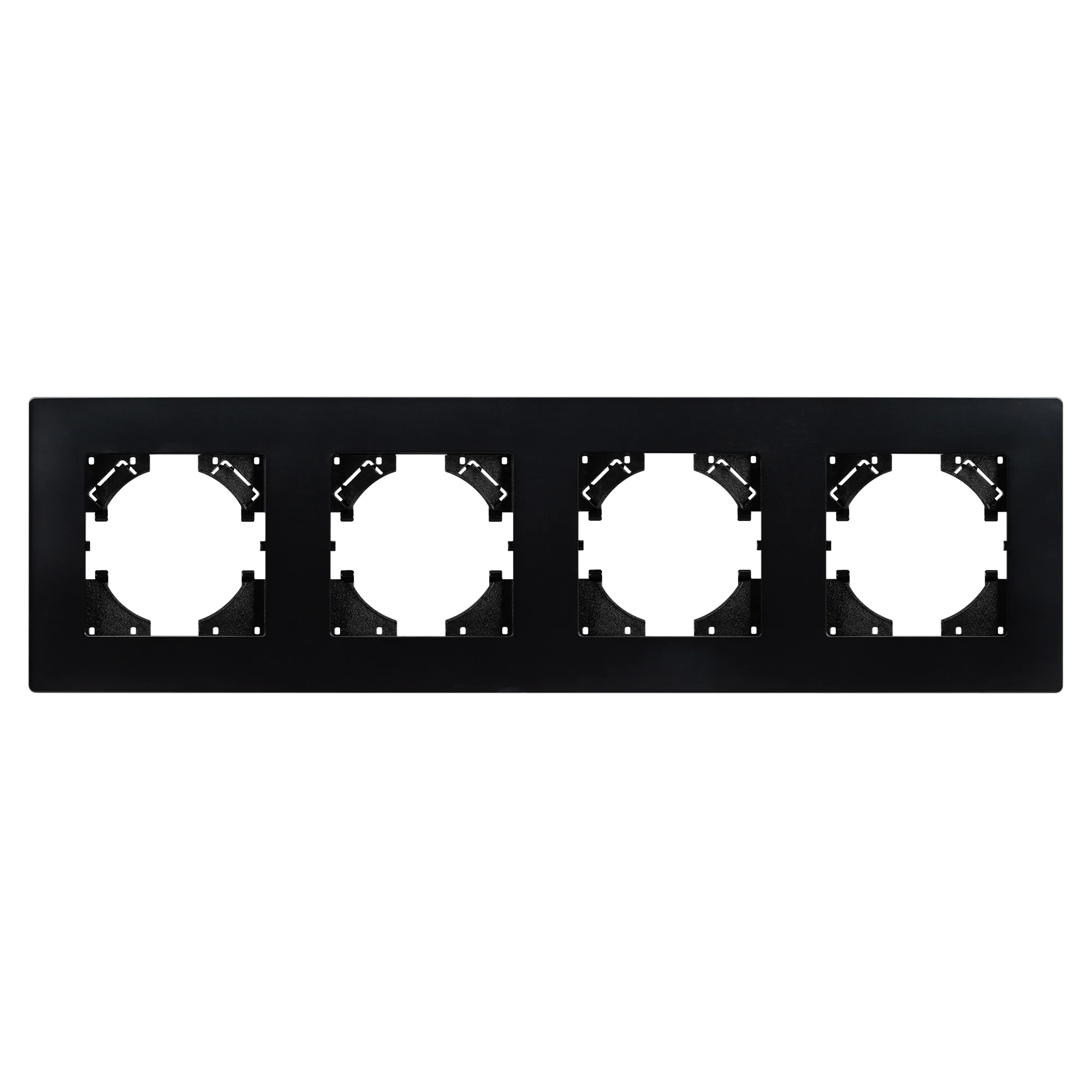 Рамка пластиковая на 4 поста, под встраиваемый механизм. Цвет - черный. Среднего уровня герметичности IP20. Ориентация монтажа - горизонтальная (основным ориентиром служат посадочные выступы для накладки механизма).