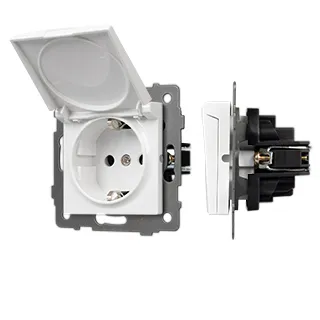 Механизм розетки с заземлением на 1 пост с влагозащитной крышкой. Цвет - белый. Без фронтальной рамки. Уровень пылевлагозащиты IP44. Устанавливается в стандартный подрозетник.