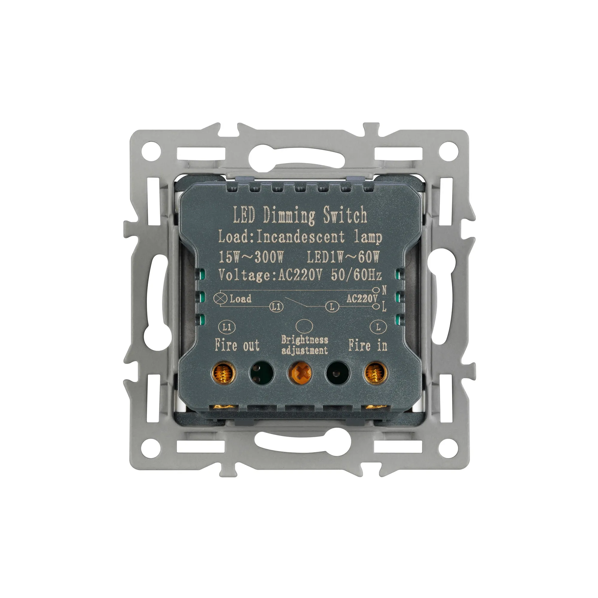 Механизм регулировки света на 1 пост, с суппортом из алюминия. Цвет - серый. Без фронтальной рамки. Уровень пылевлагозащиты - IP20. Механизм устанавливается в стандартный круглый подрозетник. Максимальная нагрузка 300 Вт только для ламп накаливания и галогенных, 100 Вт только для энергосберегающих и светодиодных ламп.