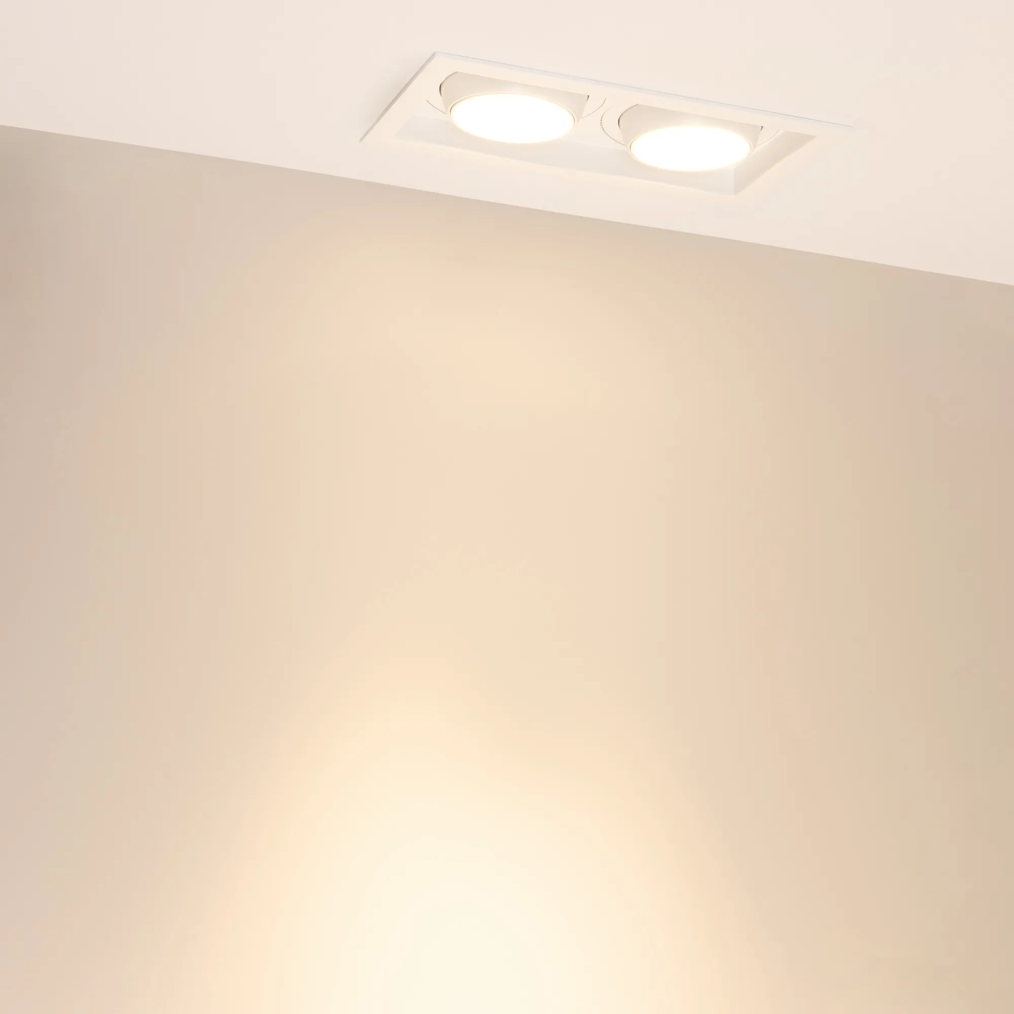 Встраиваемый карданный светильник. Мощность 2х30 Вт, св. поток 6520 лм, 109 лм/Вт, дневной 3000 K, CRI>92, угол 30°, напряжение питания 230 В. Белый корпус из алюминия, степень защиты IP20. Размер: длина 250 мм, ширина 140 мм, высота 125 мм. Монтаж встраиваемый, установочное отверстие: длина 230 мм, ширина 120 мм. Драйвер 24-42 В, 750 мА, пульсация <2%.