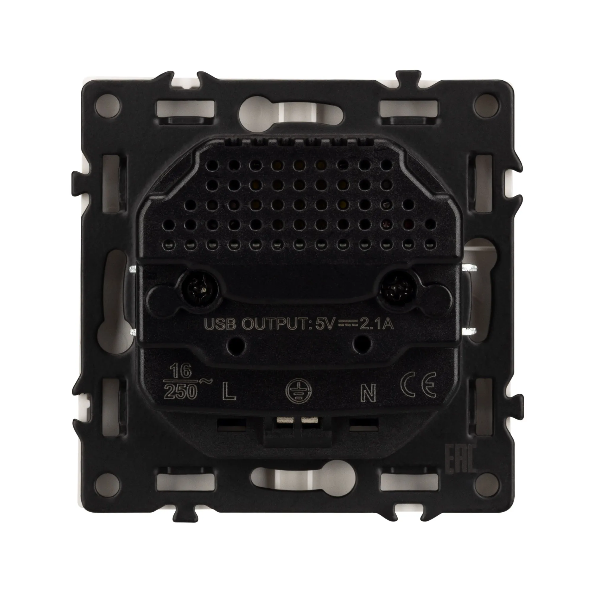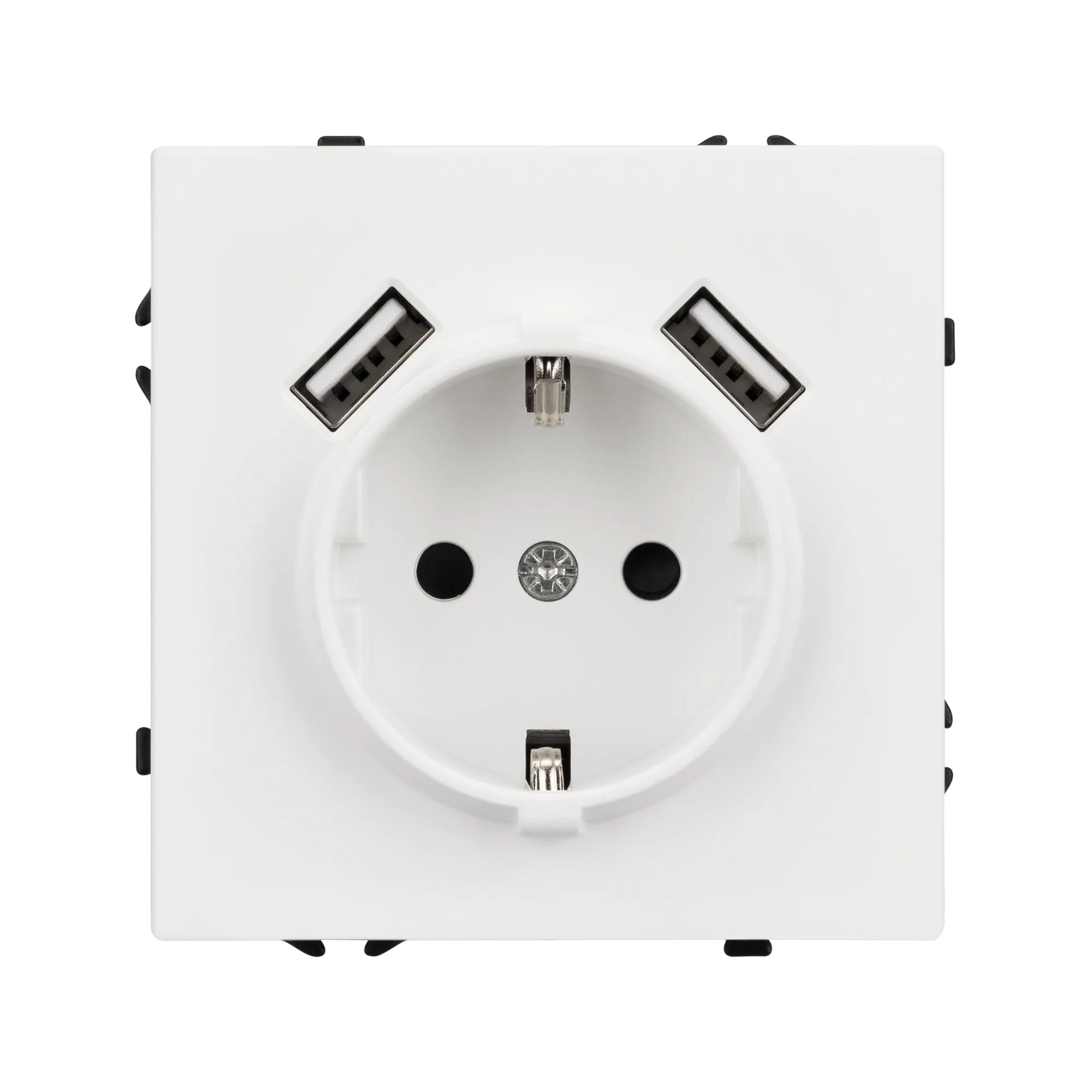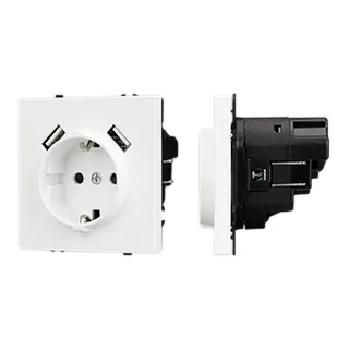 Механизм розетки с заземлением на 1 пост и 2USB Type A порта. Цвет - белый, с Soft-Touch покрытием. Без фронтальной рамки. Уровень пылевлагозащиты IP20. Розетка устанавливается в стандартный подрозетник круглого сечения диаметром 60мм.