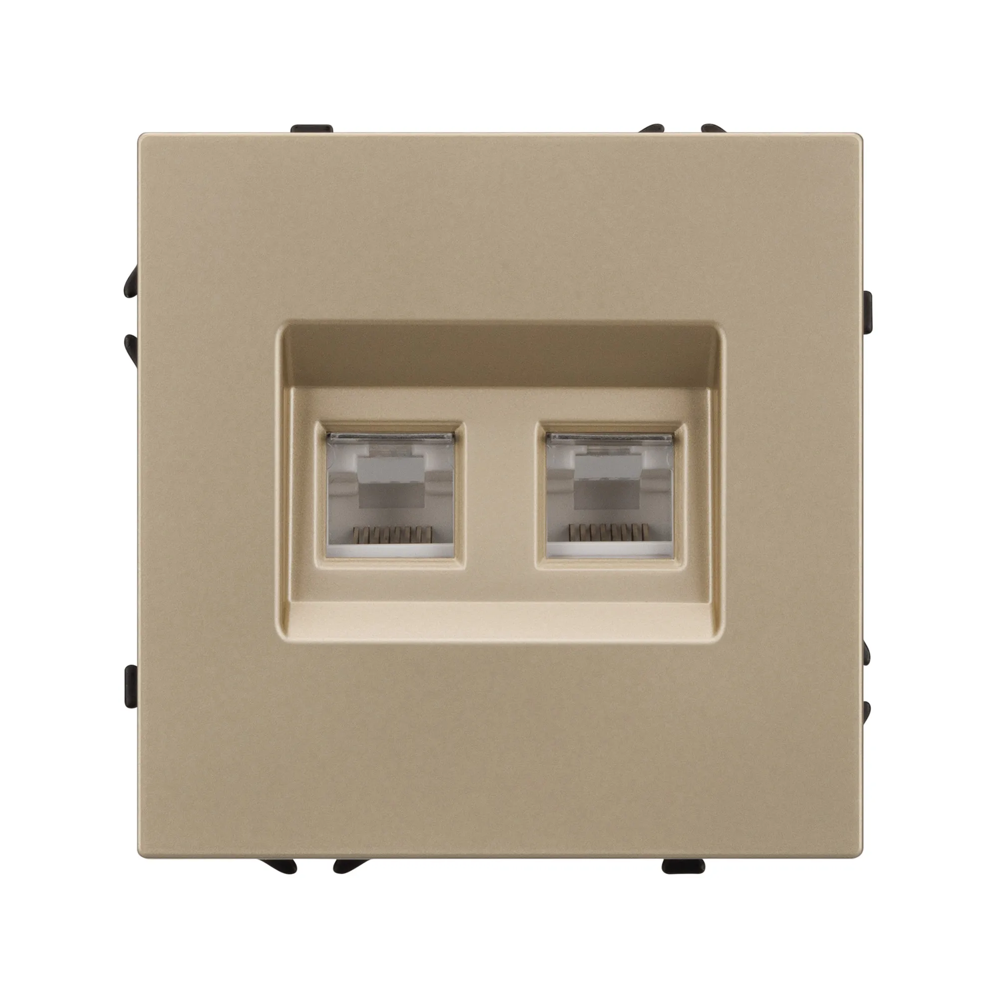 Механизм компьютерной розетки на 2 поста 6-й категории. Цвет - золотой, с Soft-Touch покрытием. Без фронтальной рамки. Уровень пылевлагозащиты IP20. Тип подключаемого разъема - RJ45. Розетка устанавливается в стандартный подрозетник круглого сечения диаметром 60мм.