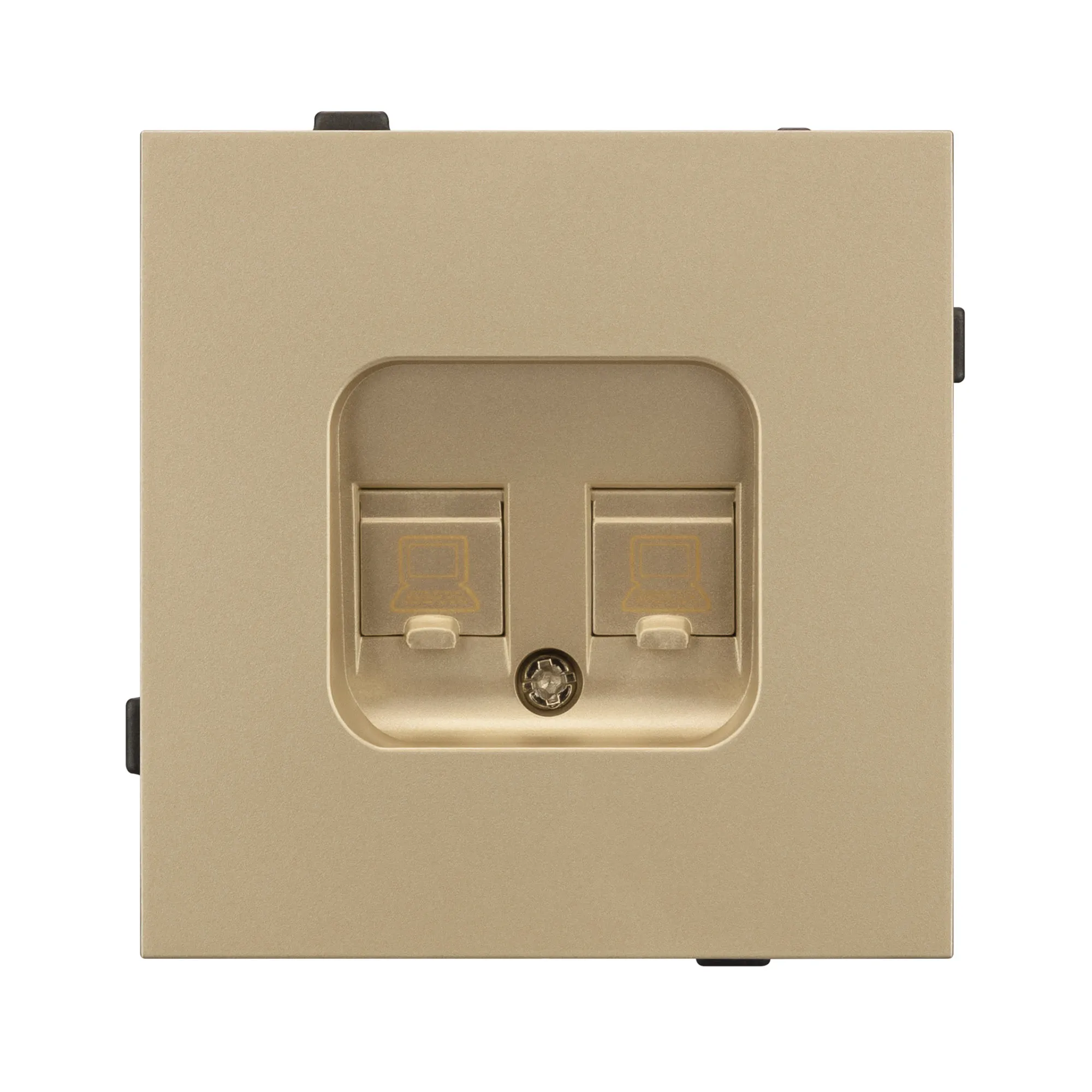 Механизм компьютерной розетки на 2 поста 6-й категории. Цвет - золотой, с Soft-Touch покрытием. Без фронтальной рамки. Уровень пылевлагозащиты IP20. Розетка устанавливается в стандартный подрозетник круглого сечения диаметром 60мм.