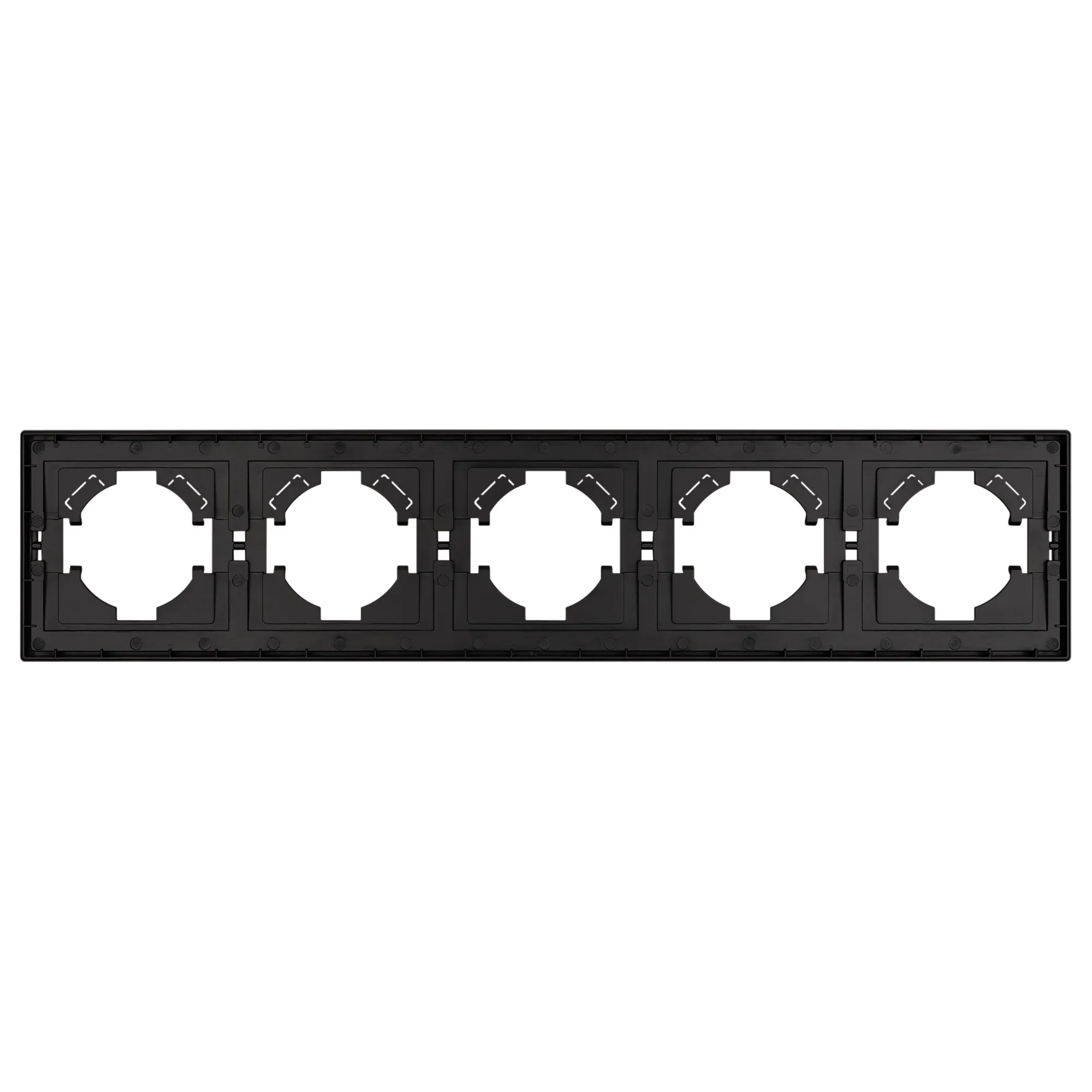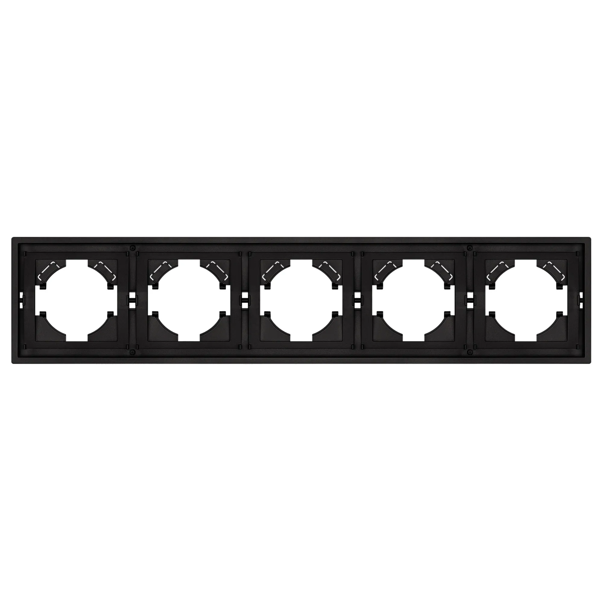Рамка пластиковая на 5 постов, под встраиваемый механизм. Цвет - черный, с Soft-Touch покрытием. Среднего уровня герметичности IP20. Ориентация монтажа горизонтальная.