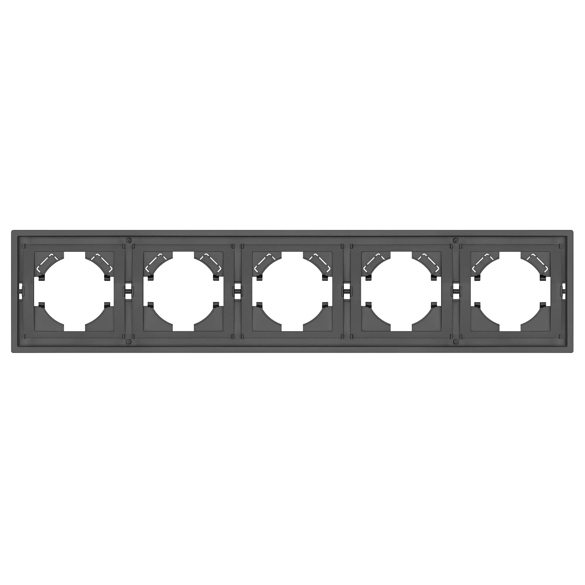 Рамка пластиковая на 5 постов, под встраиваемый механизм. Цвет - серый, с Soft-Touch покрытием. Среднего уровня герметичности IP20. Ориентация монтажа горизонтальная.